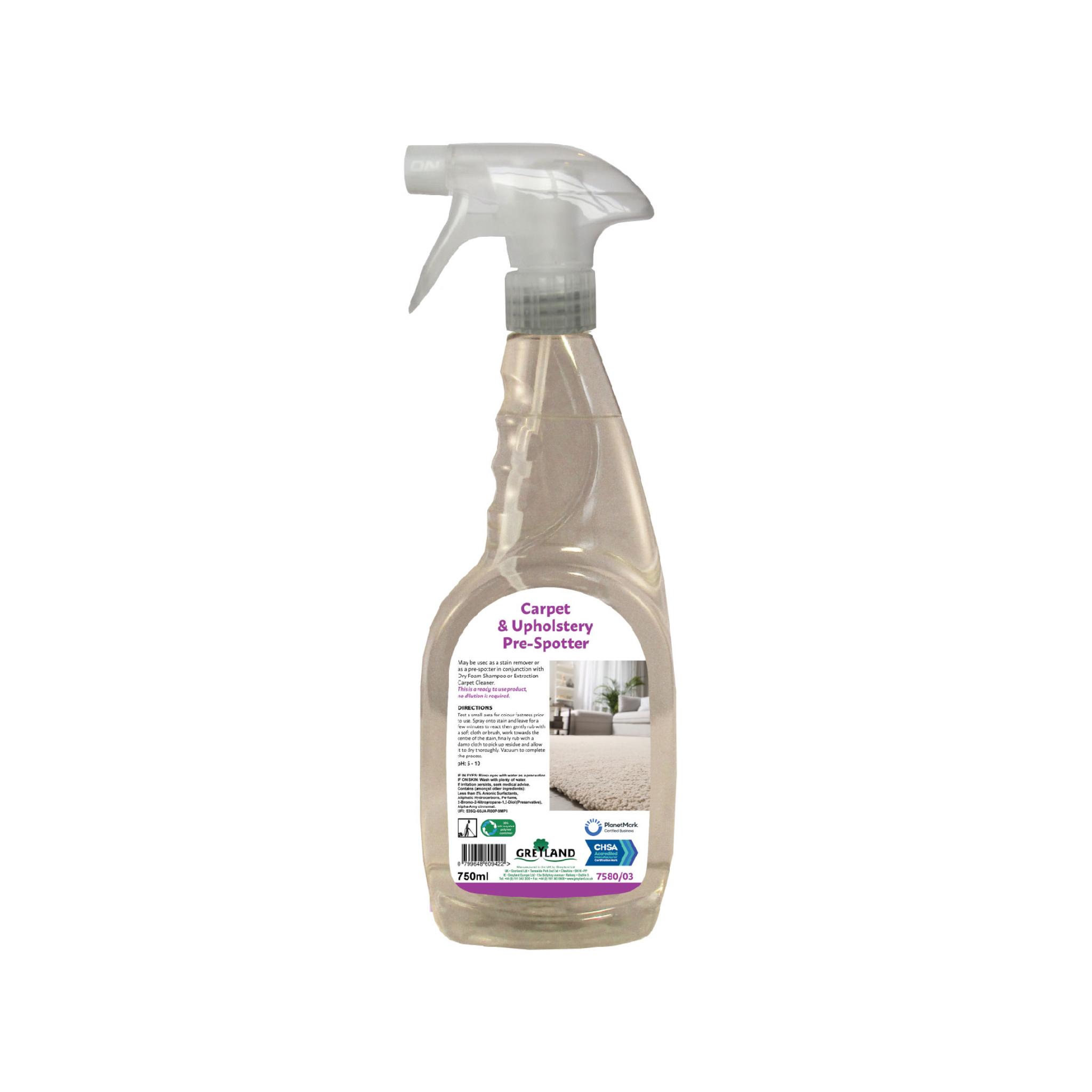 A pleasantly fragranced ready to use carpet and upholstery spot cleaner. May be used as a stain remover or as a pre-spotter in conjunction with Greyland Dry Foam Carpet Shampoo or Extraction Carpet Cleaner. This is a ready to use product, no dilution is required.