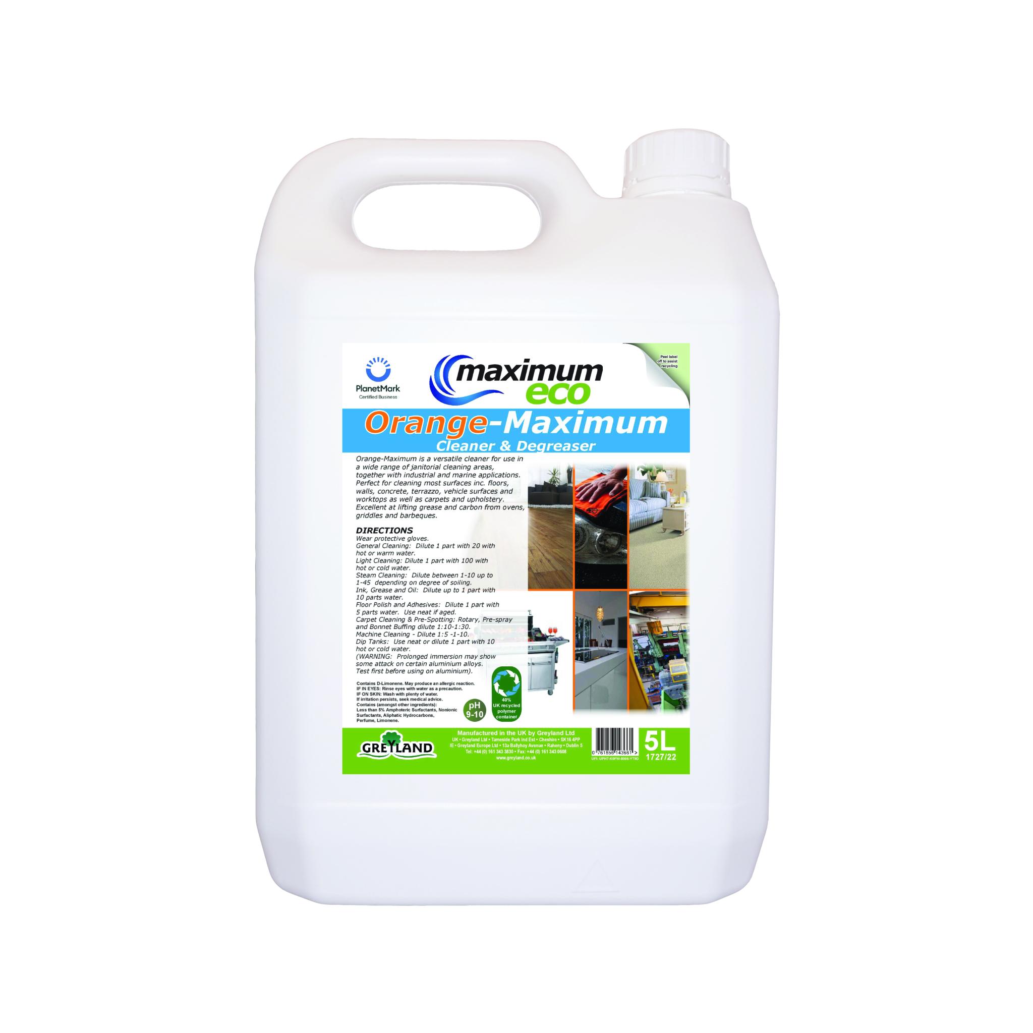 Maximum Eco Orange Maximum Cleaner & Degreaser is a powerful, versatile cleaning solution designed for both everyday and heavy‑duty cleaning. Its eco‑friendly formula combines effective grease‑cutting performance with a neutral pH and non‑hazardous classification, making it suitable for a wide range of environments—from commercial kitchens and industrial workshops to offices and home settings.